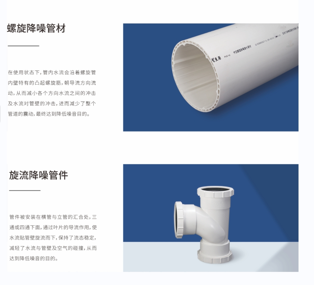 “天原”牌PVC旋流系列產(chǎn)品,內(nèi)導(dǎo)流動功能優(yōu)良、結(jié)構(gòu)強(qiáng)度高、內(nèi)導(dǎo)流葉片設(shè)計(jì)中空型,是國內(nèi)目前降噪及排水流量最佳的產(chǎn)品之一。流水通過管件在導(dǎo)流葉片的作用下呈旋流狀,附著在管道內(nèi)壁形成中空下瀉,使管壁內(nèi)空氣在旋流水壓的作用下由下向上排氣,沒有負(fù)壓產(chǎn)生,從而顯著提高排水量的同時(shí),有效降低噪音。