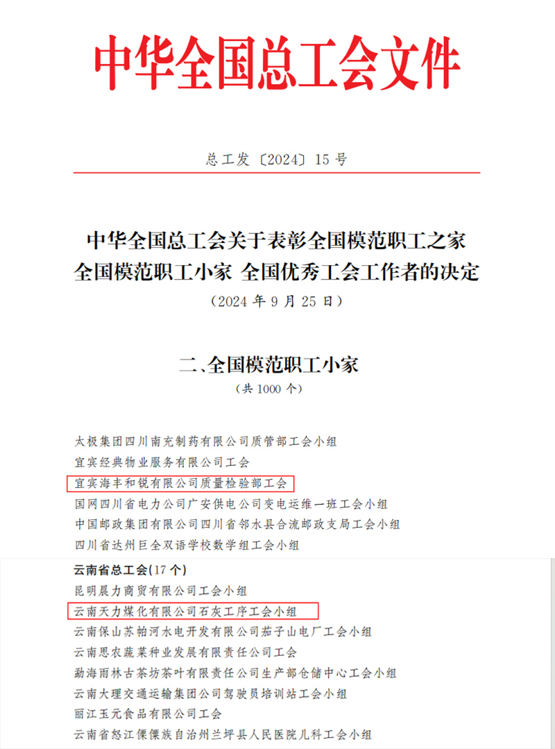 近日,中華全國總工會發(fā)布《中華全國總工會關(guān)于表彰全國模范職工之家 全國模范職工小家 全國優(yōu)秀工會工作者的決定》(總工發(fā)〔2024〕15號),集團(tuán)下屬宜賓海豐和銳有限公司質(zhì)量檢驗(yàn)部和云南天力煤化有限公司石灰工序2個工會小組喜獲“全國模范職工小家”榮譽(yù)稱號。