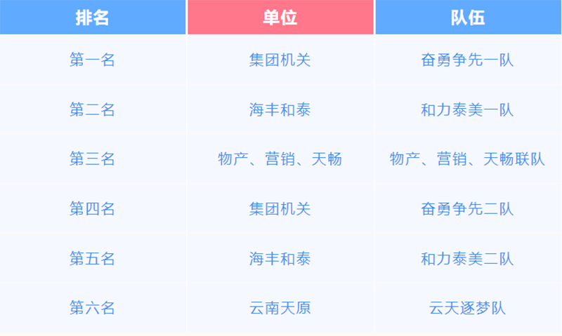 本次比賽采用混合團體賽制,設(shè)置混雙、男雙、女雙三個項目,采用小組循環(huán)賽和淘汰賽相結(jié)合的方式。賽場上,劈殺、扣球、網(wǎng)前截殺、上網(wǎng)搓球、奮力撲救......在一場場比賽中,精彩瞬間輪番上演,來自各分工會的“羽林高手”激情對決,來回穿梭的潔白羽毛球令人目不暇接,現(xiàn)場歡呼聲、加油聲此起彼伏。經(jīng)過一天的激烈比拼,最終決出了比賽前六名,他們分別是: